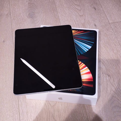 Apple iPad Pro 12.9-tommer nettbrett med 128 GB lagringskapasitet. Enheten har en skjermstørrelse på 12.9 tommer og er utstyrt med iPadOS. Fargen på enheten er sølv. Nettbrettet har støtte for tilkobling av eksternt tastatur og kan brukes til ulike formål som arbeid, studier og underholdning.