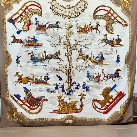 A beautiful, custom-made square scarf, produced in France by Hermès, model Chemins de Coral, designed by Annie Faivre in 2016.