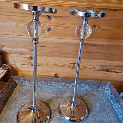To stk like lysestaker med speil. Henges opp i to fester på baksiden av platen.