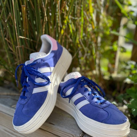 Adidas Gazelle bold sneakers joggesko i størrelse 38 2/3. Skoene har svart overdel med hvite detaljer og Adidas' karakteristiske tre striper på sidene. Sålen er tykk og i brun farge. Passer til daglig bruk og ulike fritidsaktiviteter.