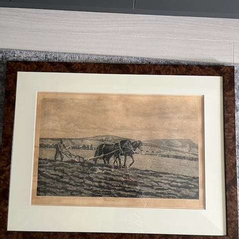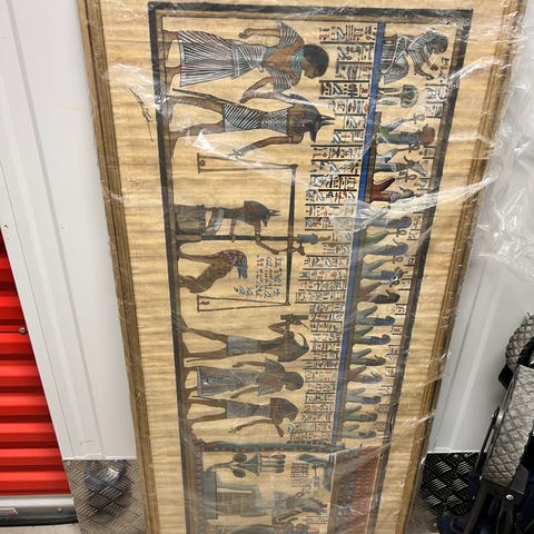 Maleri av ørkenlandskap med kamel og mennesker. Importert fra Egypt. Maleriet er i varme brune og beige toner. Kunstverket er innrammet med en gyllen ramme. Signaturen er synlig i nedre høyre hjørne.