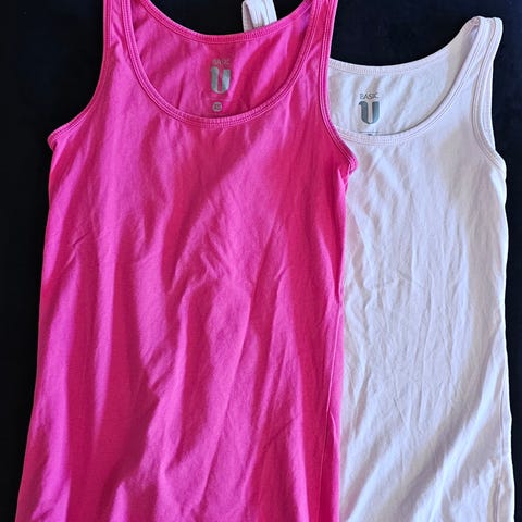 Selgeer4 singlet. De blå er fra Cubus, str xs og s, lysrosa fra HM, str M, grå fra Kaffe, str M.