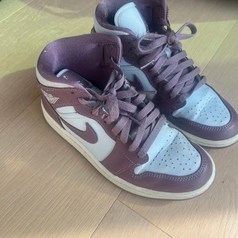 Nike Air Jordan barnesko i størrelse 36. Koeskoene har en kombinasjon av hvit, rosa og grå farge. Materialet består av skinn og tekstil, og skoene har høy ankelstøtte for ekstra beskyttelse.
