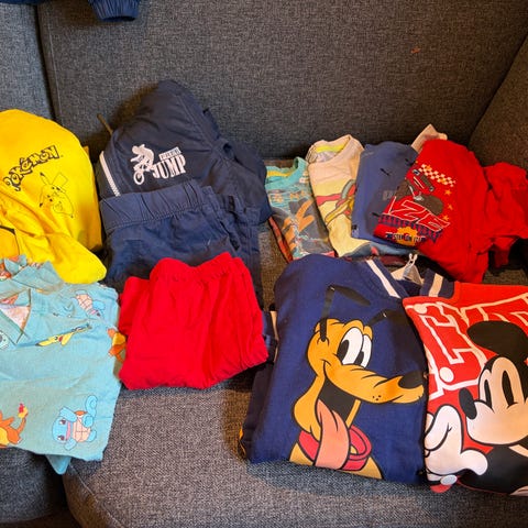 Godt men pent brukte klær selges. 3 av buksene er lite brukt. Hull på knær på favorittbuksene se bilder. Gensere er hele og fine. 3 hettegensere hvor en har glidelås og 3 vanlige gensere uten hette. fleeceaktig stoff i de fleste plaggene. Str 98-104 og noe 110