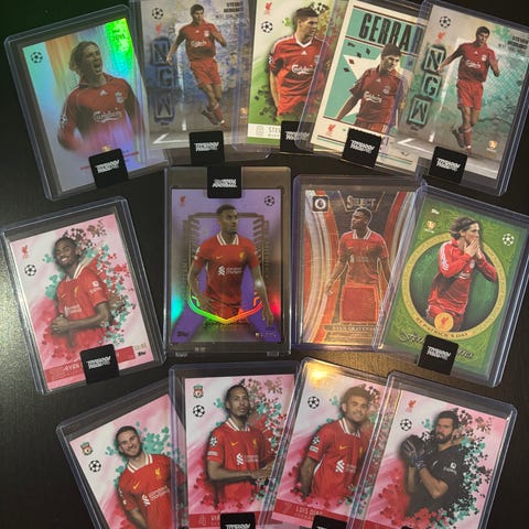 Dette er i hovedsak Topps Liverpool Team Set 23/24 fotballkort med ulike spillere som Fernando Torres i The Mighty Reds, Fabio Carvalho, Xabi Alonso, Salah, Sir Kenny i Gold Drip, Robbie Fowler, & Fabinho i Our City Legends bl.a