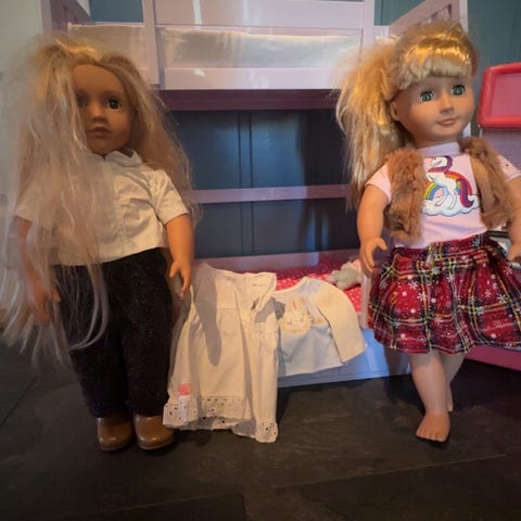To our generation dukker og to designs friend dukker med klær og oppblåsbare stoler + rullestol med tilbehør (our generation). Selges samlet, må hentes.