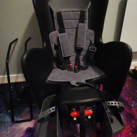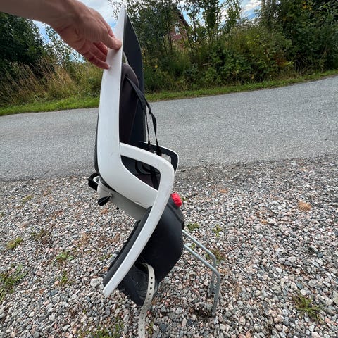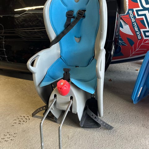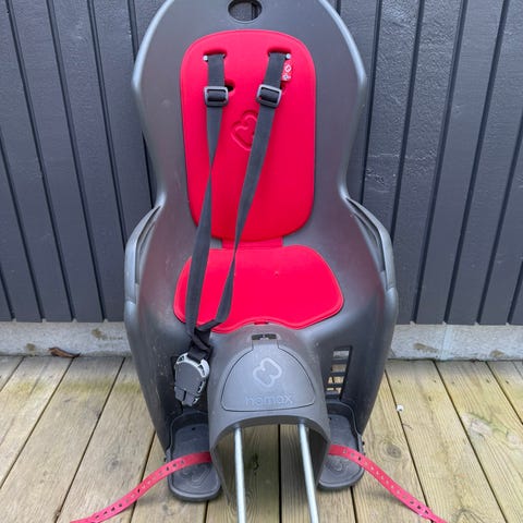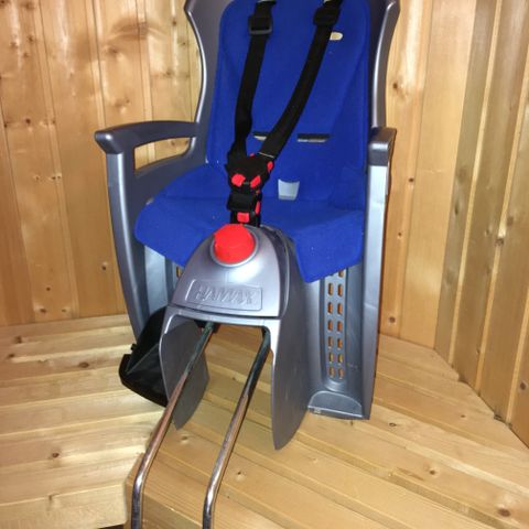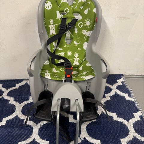 Selges da barnet har blitt for stor. Maks 22 kg. Justerbar høyde på sele og lengde på fothvilere. Festes enkelt med brakett på sykkelstanga.