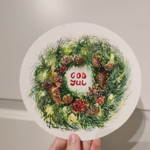 Vakkert vintermotiv.(obs-ramme følger ikke med). Malt på 100% bomullspapir fra Archer. Måler 14,8 * 21 cm (A5).