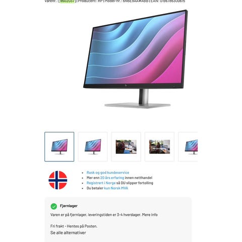 🖥️ 2 stk HP EliteDisplay E243 – 24" skjermer med Full HD-oppløsning (1920 x 1080), IPS-panel og justerbare stativer for optimal ergonomi