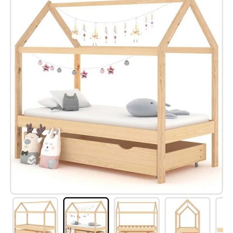 Hjemmelaget seng med oppbevaring. Jeg har skrudd sammen 3 IKEA Smaåstad kommoder og lagt en 90×200cm sengeramme oppå som er festet på list på veggen bak, og skrudd opp en bred list foran. Sengehesten er fra en barneseng, har mye synlig slitasje på toppen. Se bilde. Passer for barn og gir praktisk oppbevaringsplass under sengen. Demonteres og fjerner klistremerker før henting. Listen foran har merker etter klistremerker.