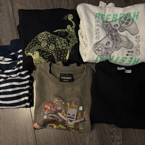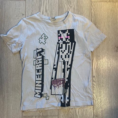 KappAhl Minecraft langermet T-skjorte i størrelse 134 for gutt. T-skjorten har flerfarget design med grønn base og svart innererm, samt trykk med Minecraft-motiv på fronten.
