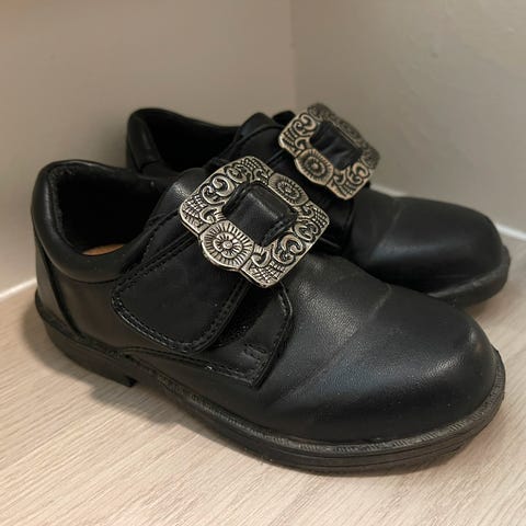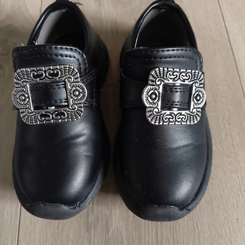 Svært pent brukt bunadsko i str 24. Fremstår som ikke synlig brukt. Sort skinnimitasjon, skinnsåle inni. Gode og myke. Enkel å ta av og på med borrelås.
