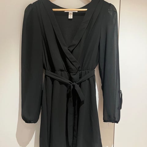 NA-KD festkjole i størrelse L, svart farge. Kjolen har lange ermer med rysjedetaljer ved mansjettene og en knyting i front. Laget av lett og gjennomsiktig materiale med fôret skjørtdel.