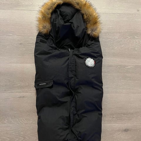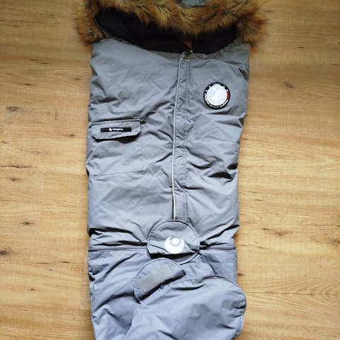 Vinterposen har vært på renseri, og er ikke brukt siden. Derfor framstår den som ny. Posen mangler den nederste delen som gjør at den kan forkortes. Altså passer den ikke for de minste barna.