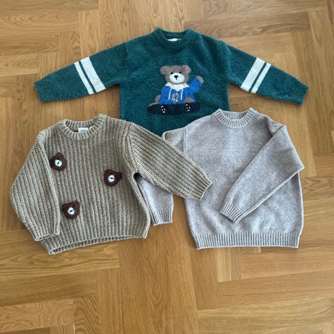 Pent brukt. En Bamsegenser og en stripere genser. Strikket selv. Kan brukes til begge kjønn. Størrelse 12-18 måneder. Ull.