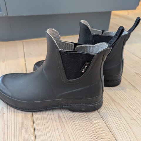 Tretorn lave gummistøvler i størrelse 37. Støvlene er svarte med et felt i burgunder på sidene. Pent brukt, såle i god stand, noe bruksmerker på støvlene. Sendes mot frakt eller hentes i Stensgata i Oslo.