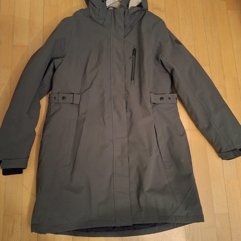 Grønn, lett foret jakke fra Only i størrelse M. Fin til høsten og våren. Justerbar strikk i midje og hette, fire lommer og justerbar splitt bak.