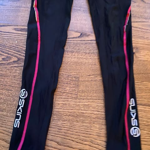 Skins Løping tights for kvinner i størrelse S. Tightsen har en kombinasjon av lilla og rosa farger og er laget i materialer som egner seg for løping.