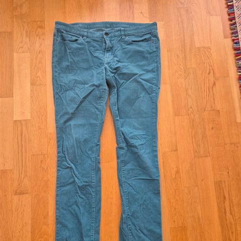Avslappet bukse i middels høyde med glidelås og lomme i fløyel