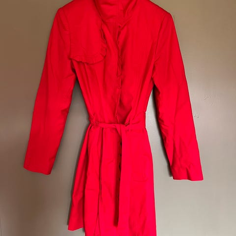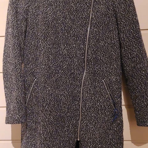 Pen kåpe fra Oasis selges. Den har knapper foran og knyting rundt. Lommer av brukbar størrelse som kan lukkes med knapp. Fronten kan festes oppe i halsen for mer isolasjon. Rekker meg (1,78) til litt over knærne.