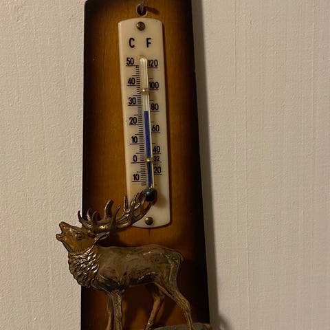 Veggtermometer i tre med en dekorativ seilskipmotiv.