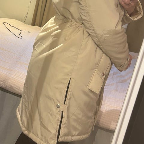 Jakken er nesten ikke brukt. Den har hengt ytterst på et klesstativ ved et vindu og har blitt utsatt for sollys. Jeg tror det er årsaken til at det er litt misfarging av «pels» - se nærbilde av dette. Det er lite synlig (syntes jeg) når jakken er på.