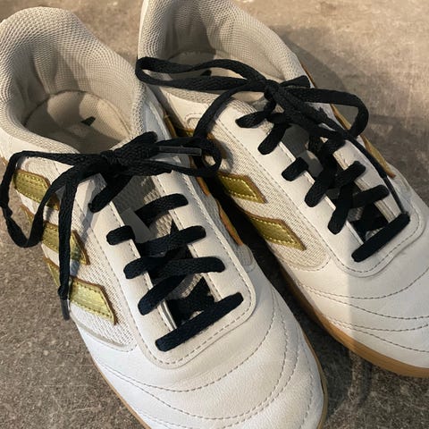 Ble kjøpt med hensikt om å ha klar et par nye sko til ny sesong, men guttungen bestemte seg for å vokse to størrelser i løpet av sommeren.