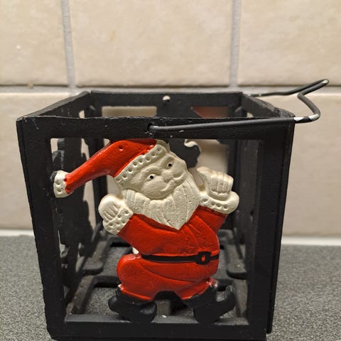 Vintage smijern lysholder til 7 lys. Pynt i form av 6 gullfargede kuler og litt kongler og granbar i plast.