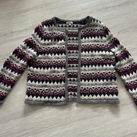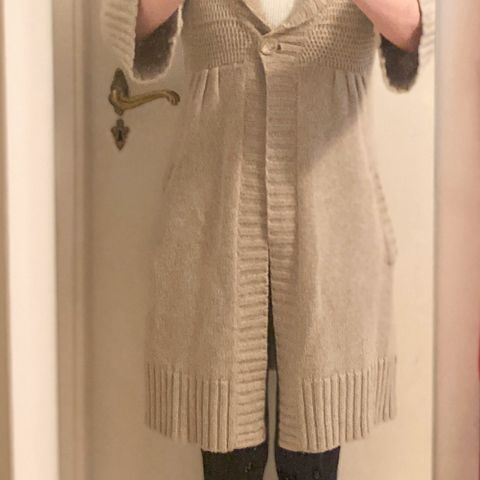 Nydelig strikkejakke med høy krage som gjør den fin både åpen og lukket ( lukkes med en hempe)