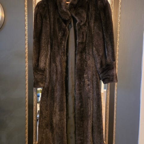 Kåpen har minkbesetning på ermene, i kragen og i front av kåpen. Diskret lukking med hekter. Den er foret med kaninskinn og deilig og varm.
