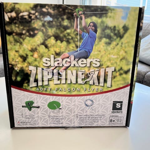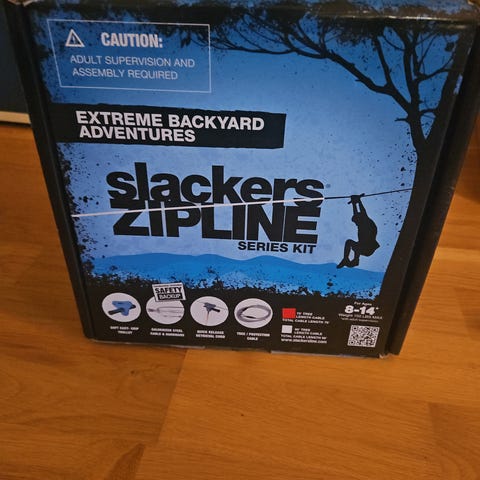 Selger et pent brukt Slackers zipline set med 30m lang wire. Effektiv lengde vil i praksis være noe kortere.
