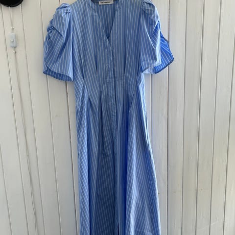 Cathrine Hammel festkjole i blå farge, størrelse M. Kjolen har kort erme og er laget i et materiale som gir et lett og behagelig uttrykk. Passer til formelle anledninger.