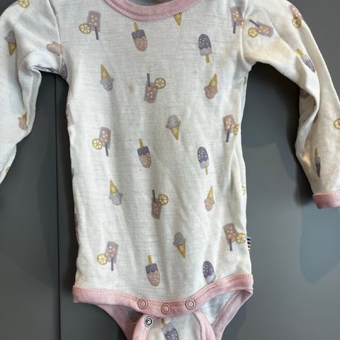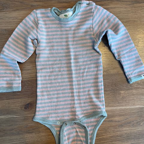 Pent brukt Joha Ullbody i størrelse 68 for barn, unisex. Laget av en blanding av 53% ull, 42% økologisk bomull og 5% polyamid. Bodyen har lange ermer og lilla stripemønster.