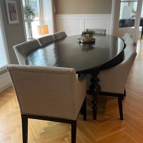 Stolene er av merket Home factory og kjøpt for over 3000 kr pr stol for noen år siden. Stolene er renset regelmessig. Noe synlig slitasje på bena på noen av stolene, og noen bruksmerker, selges derfor til sterkt redusert pris.. En av stolene har fått noen flekker med hvit maling og selges derfor enda rimeligere.