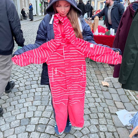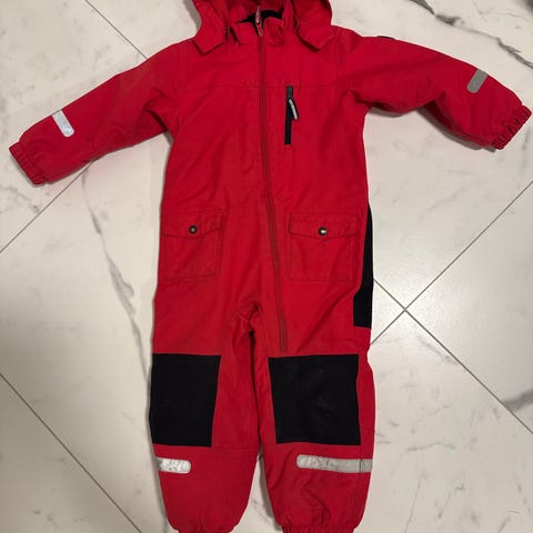 Polarn O. Pyret Vinterdress for barn i størrelse 104. Dressen er rød og designet for både gutter og jenter (unisex). Laget for å gi varme og beskyttelse i kaldt vær, egnet for utendørs bruk. Dette er en trelagsdress. Den er synlig brukt, men ingen hull eller skader og har masse bruk igjen!