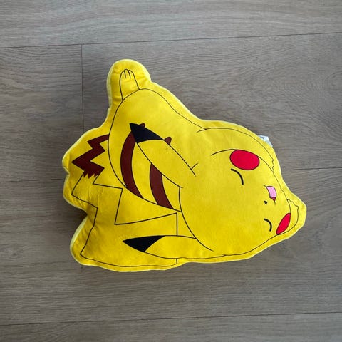 Pokémon Pikachu myk lekepute i gul farge med røde kinn og svarte detaljer på ører og hale. Passer for barn og kan brukes som pute eller lekefigur.