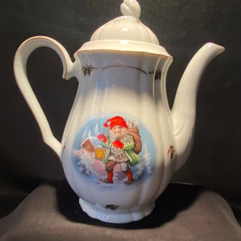 Hvit med rød dekor, håndtak og tut i perfekt stand. Ideell til te, gløgg, kakao eller som dekor på hylla.