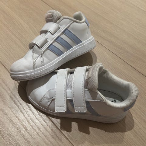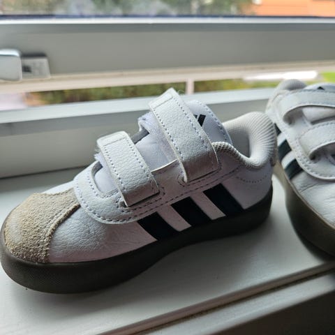 Godt brukte Adidas sko, men mye bruk igjen. Hele og fine, men litt skitne. Brukt til 1 barn.
