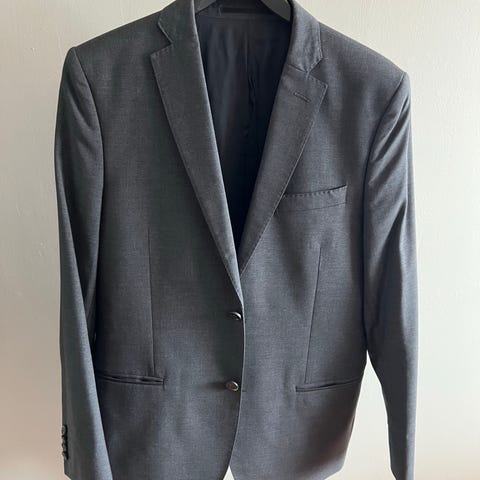 Dressmann dressjakke i svart farge, størrelse 52 for menn. Jakken har to knapper foran, klassisk reverskrage og er foret med stripete stoff på innsiden. Passer til formelle anledninger og kontorbruk.