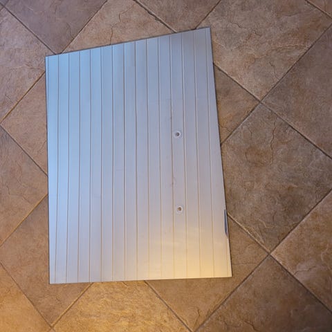 Liten skade helt nederst i hjørnet, lite synlig når opphengt.