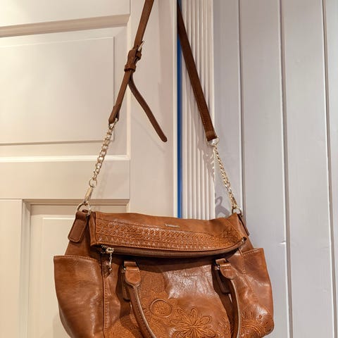 Fargerik og fin veske fra Desigual. Kan bæres både i hånd, over skulder og crossover. Lys bunn med fargerikt mønster og rosa detaljer. I fin stand, men noe slitasje ved festet på hankene. Inni er det etterord rom + glidelåslomme og 2 tøylommer. Veska er 25 cm høy og 29 cm lang. Bred bunn så den kan stå på gulvet. Kan hentes i Oslo eller sendes. Kjøper betaler porto.