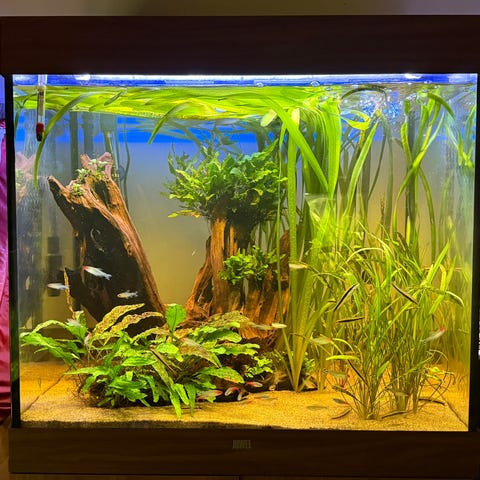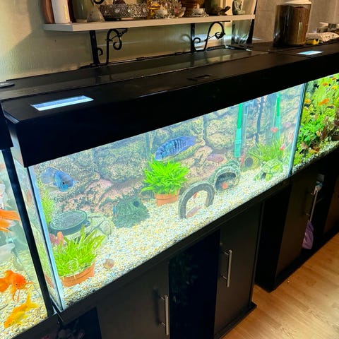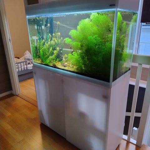 Akvarium med skap og 60l og 2 mnd gammel. Jeg skal oppgradere til større.uten fisk og planter.noen ting føler med.