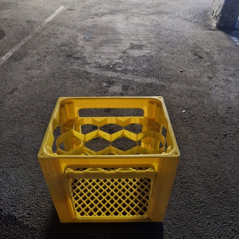 Selger en gul plast-rampe fra merket Curb Ramp, som er beregnet for å kjøre ned last fra europall eller fortau. Rampen er brukt, men ingen synlige skader, og fungerer som den skal.