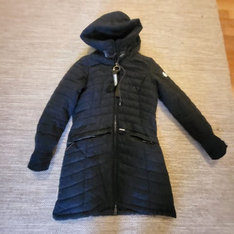 Mørkegrå ullkåpe (38% ull) i størrelse S fra Bergans. Formsydd, slitesterk og av god kvalitet. Ikke for de kaldeste dagene. Noe nuppete nederst på baksida, men likevel i god stand.
