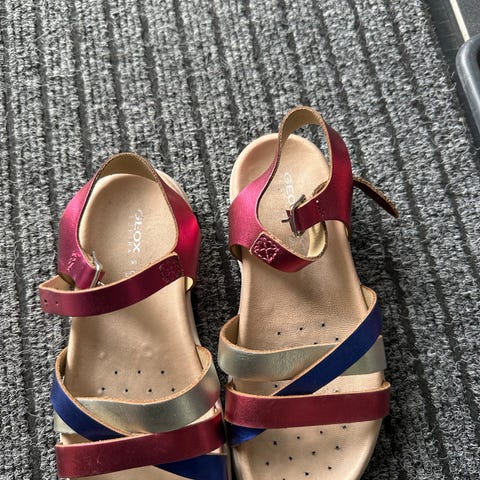 Geox Sandaler for jente i størrelse 30. Sandalene har flere farger inkludert rosa, blått og gult, med justerbar stropp rundt ankelen, enkle å ta av og på da det er glidelås bak.