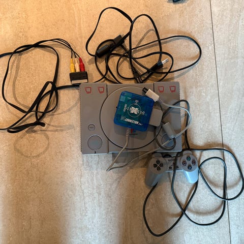Selger en pent brukt PS1 med original kontroller og kabler.