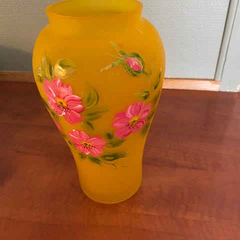 21 år gammel håndmalt glassvase signert av kunstneren.