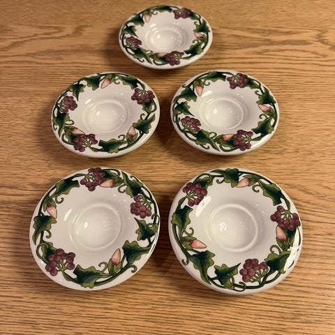 Selger 4 fine skåler til kaffekopper i serien Vivaldi fra Figgjo. I hel og fin stand. Få brukspor. 14,5 cm i diameter.