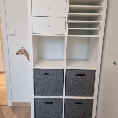 Kallar hylle med to skuffrseksjoner, to ekstra hyller og dør 70x70. Stål ben 11cm. Hyllen fremstår som ny og har kun stått i en bod. Ny pris: Kallax hylle kr 995, to skuffeseksjoner 2xkr 250, dør ca kr 200, bein kr 200, ekstra hyller kr? Totalt over ca kr 2000 Må hentes