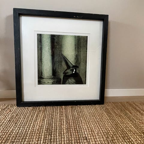 Informasjon om bildet jeg selger: Med ramme måler bildet ca 98 cm X 66 cm. Uten ramme måler bildet ca 68 cm X 30 cm. Tittel: Uten tittel. Teknikk: Gummitrykk. Opplag: 25 stk. Pris (opprinnelig): kr 4000,- Bildet må hentes på Stabekk.